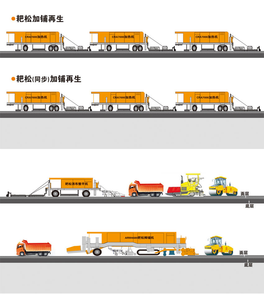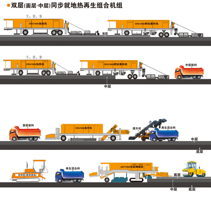 双层再生:旧路面面层( 4cm)和中层( 6-7cm )  同步摊铺再生,适用于高等级路面大中修施工。